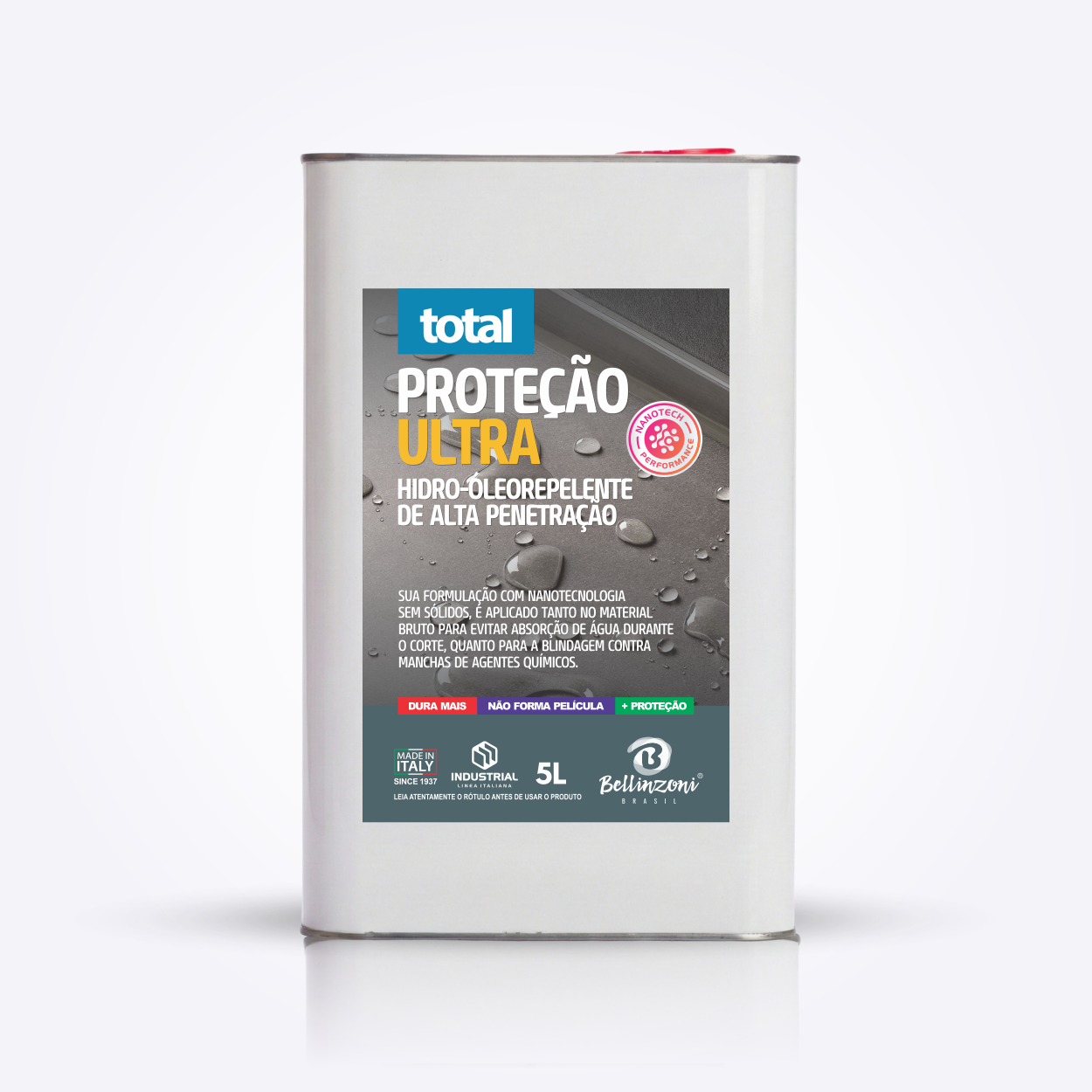 Hidro-óleorepelente de alta penetração, composto concentrado. Barreira transparente de alta performance, desenvolvida com uma nanotecnologia sem a presença de sólidos; permite uma penetração profunda na massa rochosa dos materiais posteriormente submetidos ao beneficiamento. A aplicação prévia ainda no material bruto, impede a absorção constante de água do material no processo do corte. TOTAL PROTEÇÃO ULTRA evita reações adversas da resina estrutural com a alta umidade. Tanto é utilizado antes do corte para prevenir a alta concentração de umidade; quanto na finalização de materiais para blindagem contra machas através de agentes químicos na superfície.